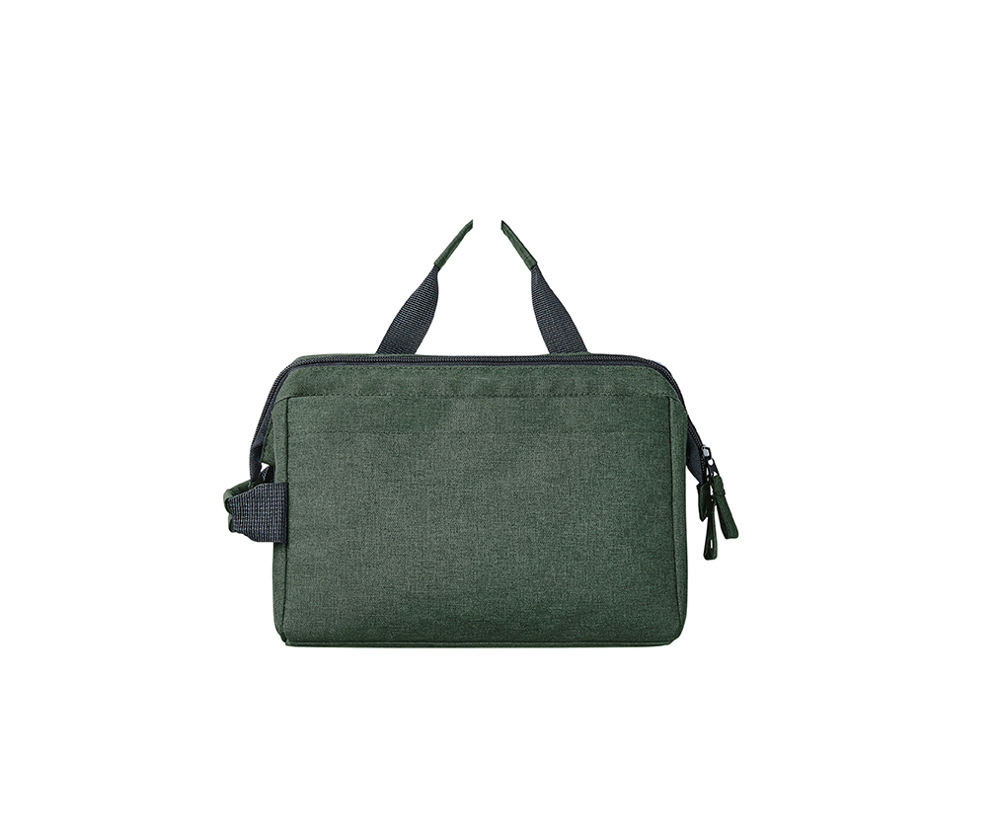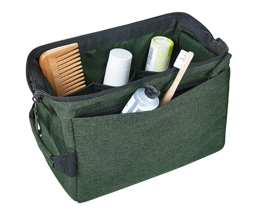 Stylish zip pocket bag with sturdy metal hoop opening for upright standing or hanging; rPET outer material; large, padded main compartment, with various organiser elements; front pocket with zip; handle