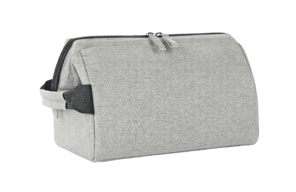 Stylish zip pocket bag with sturdy metal hoop opening for upright standing or hanging; rPET outer material; large, padded main compartment, with various organiser elements; front pocket with zip; handle