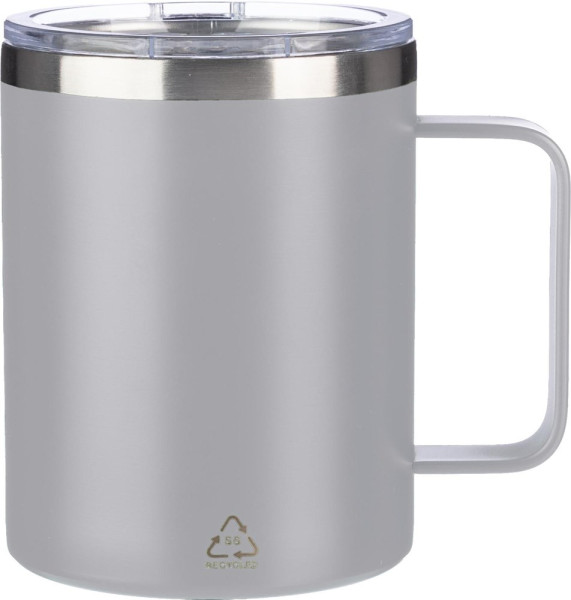 Doppelwandiger Trinkbecher (300 ml) aus Edelstahl (S/S304) mit mattem Finish. PS-Verschluss auf der Oberseite mit Verschluss.Enthält das Logo aus recyceltem Edelstahl auf der Vorderseite des Bechers. Einzeln verpackt in einem braunen Karton.