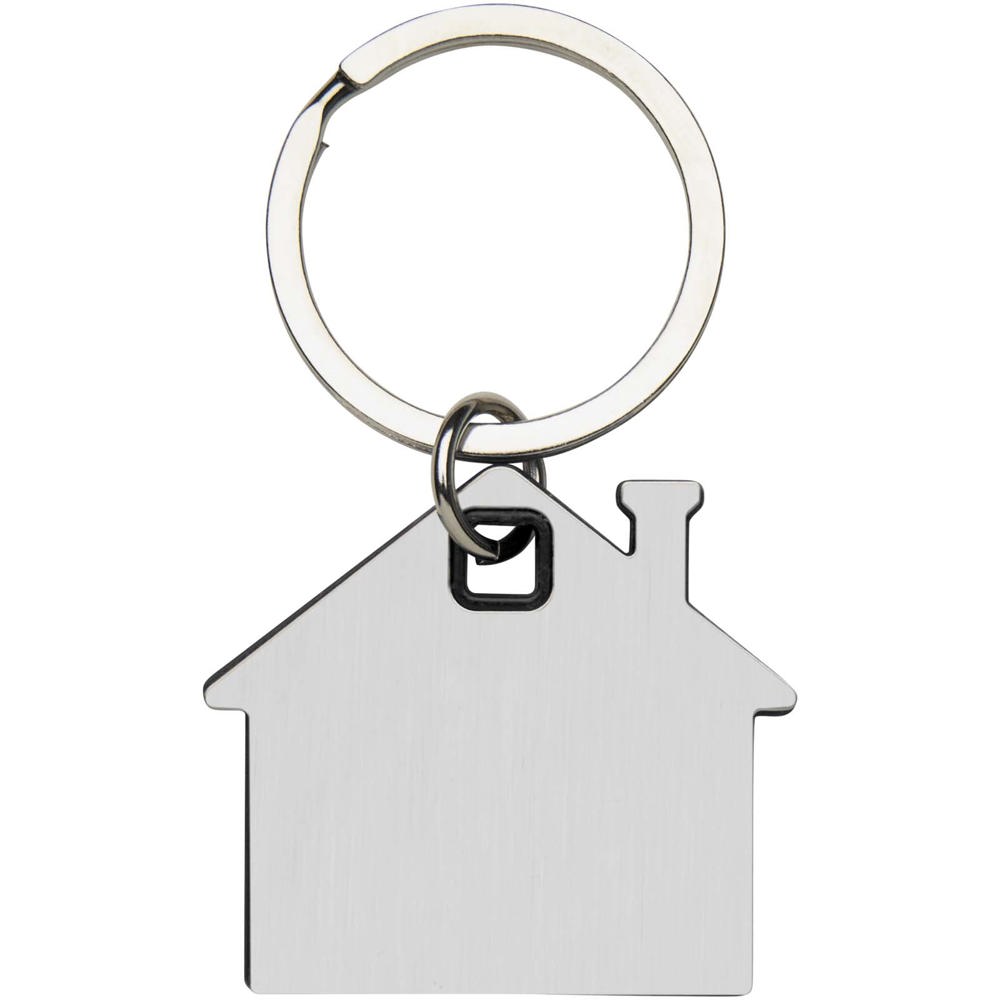 Schlüsselanhänger in Form eines Hauses mit einer Edelstahlplatte mit mattem Design auf der Vorder- und Rückseite und einem farbigen Kunststoffchip in der Mitte.