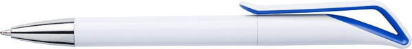 Drehkugelschreiber aus Kunststoff, mit farbigen Akzenten und blauer Mine.