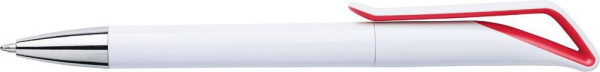 Drehkugelschreiber aus Kunststoff, mit farbigen Akzenten und blauer Mine.