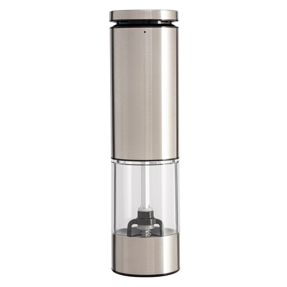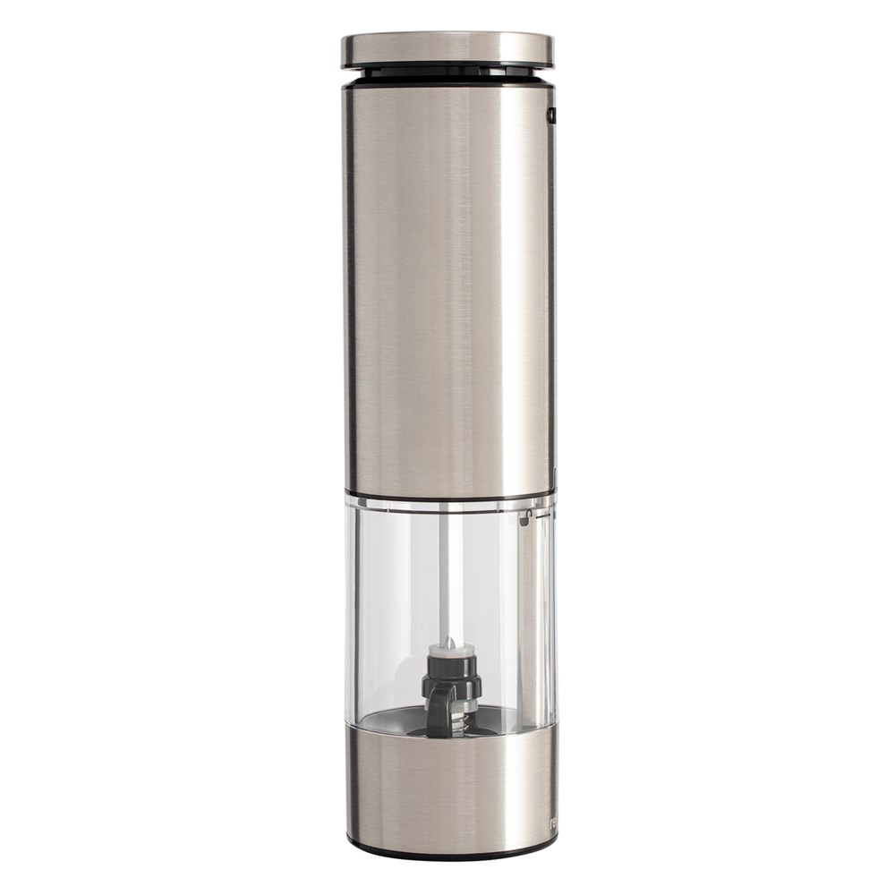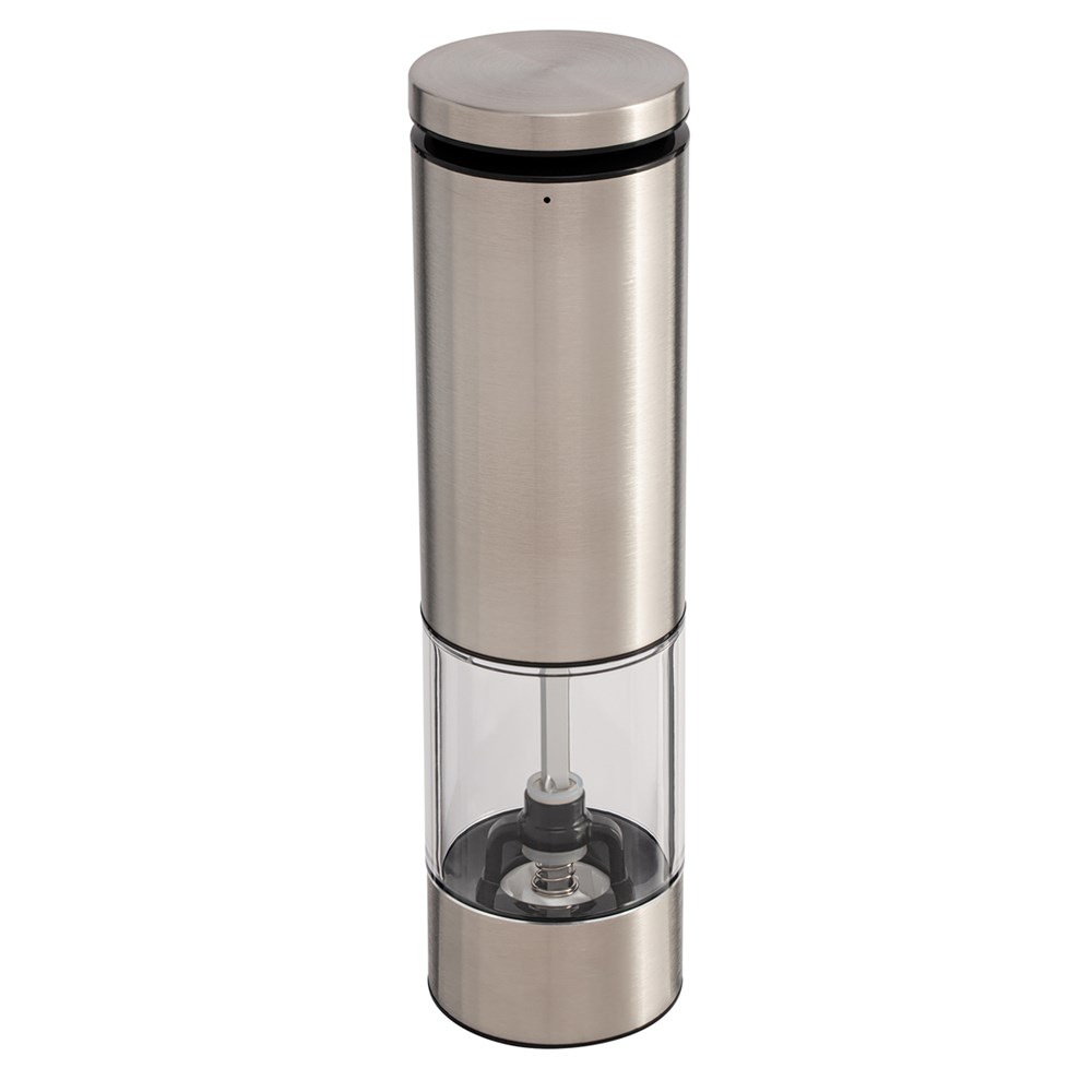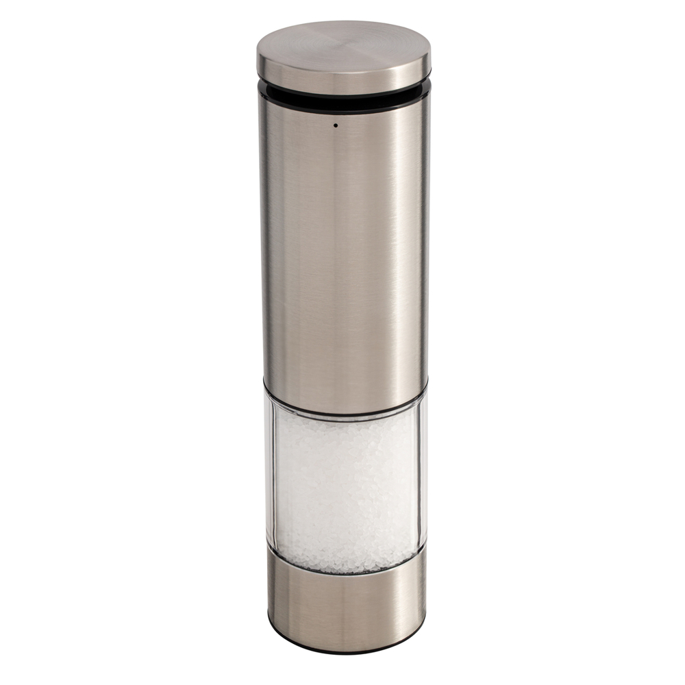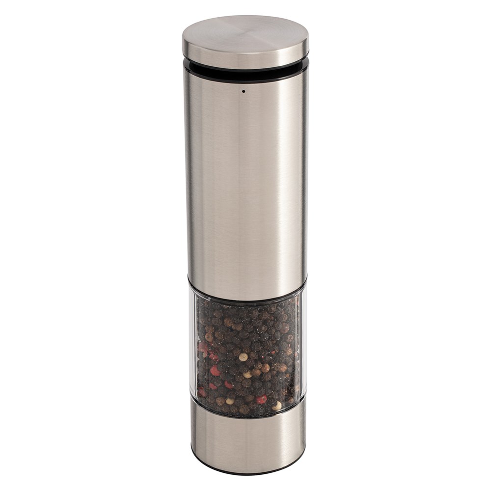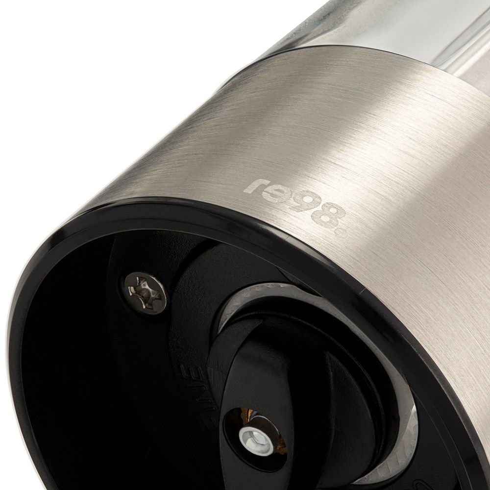 Peppen Sie Ihren Esstisch oder Ihre Küche auf - mit dem edlen RE98-Cevaro! Die elektrische Salz- oder Pfeffermühle aus Edelstahl zeichnet sich durch langlebige Qualität und komfortable Bedienung aus. Mit einem leichten Knopfdruck startet der Mahlvorgang, während ein integriertes LED-Licht automatisch leuchtet. Ein hochwertiges Keramikmahlwerk sorgt für perfekt gemahlenes Salz oder Pfeffer. Durch das Einstellrad an der Unterseite, kann die Körnung stufenlos von grob („coarse“) bis fein („fine“) bestimmt werden. Der Fuß der Mühle hat einen schwarzen Staubschutzdeckel.