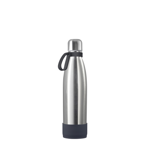 Für Heiß- oder Kaltgetränke, unsere doppelwandige Edelstahlflasche überzeugt durch trendiges und funktionales Design. Durch die Doppelwandigkeit mit Vakuum bleiben ihre Getränke lange kalt bzw. heiß. Die Trinkflasche kann mit edlem mattschwarzem, weißem Powder Coating oder natürlich silberglänzend bestellt werden. 500 ml Fassungsvermögen stehen zur Verfügung. Setzen Sie ihr Logo stilvoll in Szene auf der Trend Trinkflasche schlechthin.