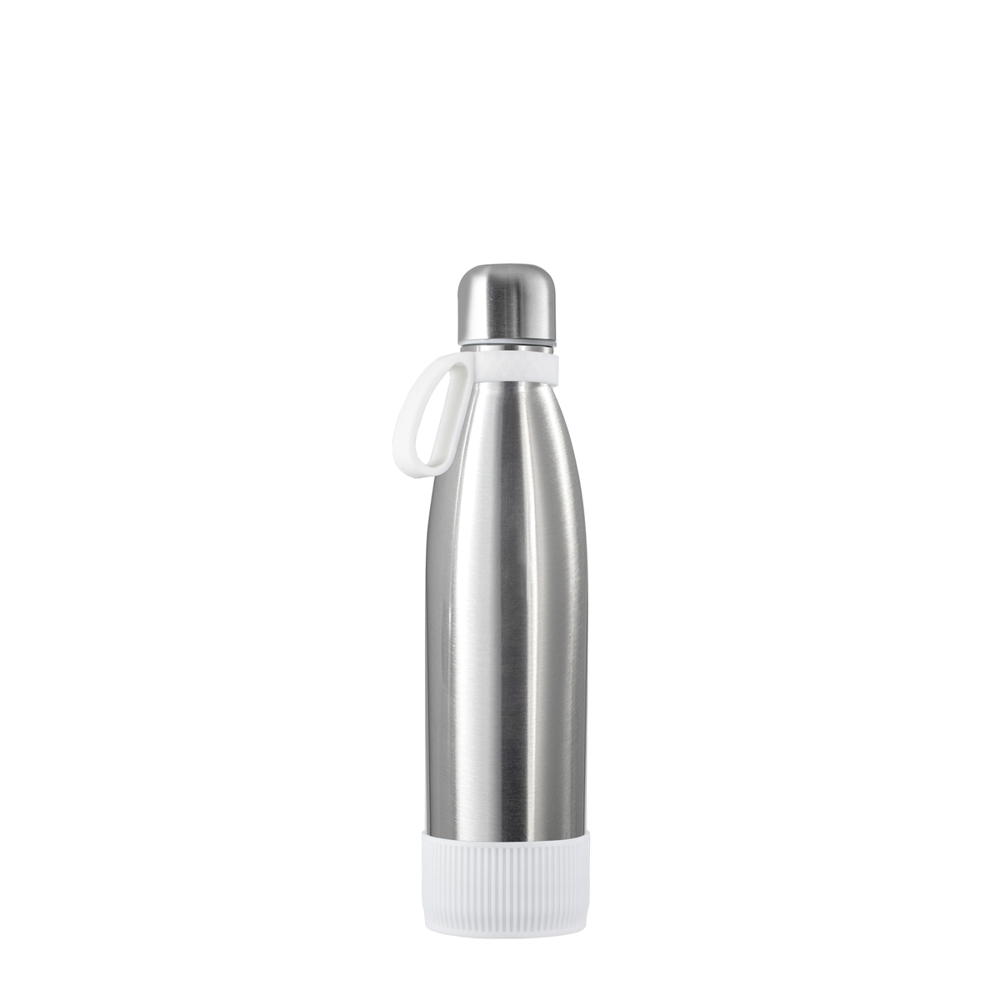 Für Heiß- oder Kaltgetränke, unsere doppelwandige Edelstahlflasche überzeugt durch trendiges und funktionales Design. Durch die Doppelwandigkeit mit Vakuum bleiben ihre Getränke lange kalt bzw. heiß. Die Trinkflasche kann mit edlem mattschwarzem, weißem Powder Coating oder natürlich silberglänzend bestellt werden. 500 ml Fassungsvermögen stehen zur Verfügung. Setzen Sie ihr Logo stilvoll in Szene auf der Trend Trinkflasche schlechthin.