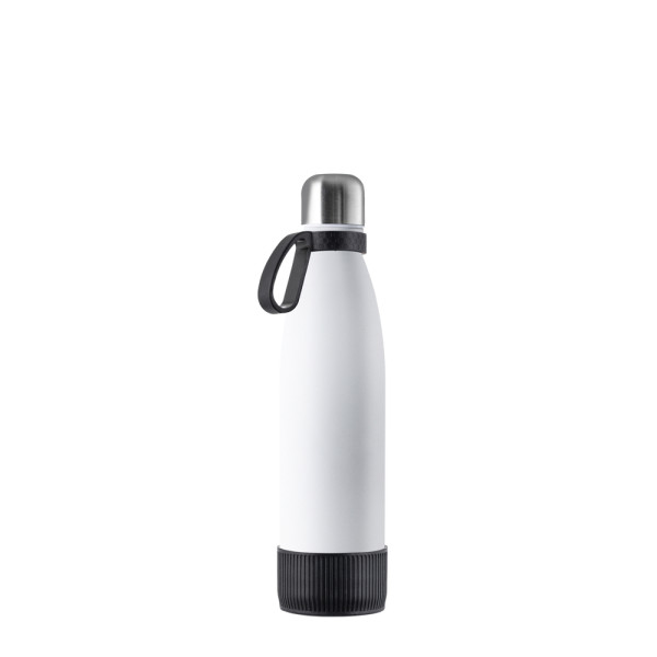 Für Heiß- oder Kaltgetränke, unsere doppelwandige Edelstahlflasche überzeugt durch trendiges und funktionales Design. Durch die Doppelwandigkeit mit Vakuum bleiben ihre Getränke lange kalt bzw. heiß. Die Trinkflasche kann mit edlem mattschwarzem, weißem Powder Coating oder natürlich silberglänzend bestellt werden. 500 ml Fassungsvermögen stehen zur Verfügung. Setzen Sie ihr Logo stilvoll in Szene auf der Trend Trinkflasche schlechthin.