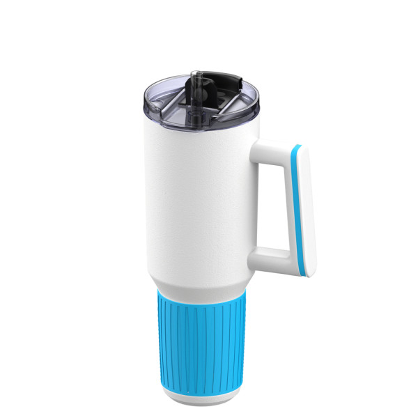 The trendy 900 ml thermo mug with handle, lid and Tritan straw impresses with high quality and the possibility for individual design. Coloured silicone accessories on the handle and, optionally, a silicone sleeve on the lower part of the mug give it a distinctive appearance with high recognition value.