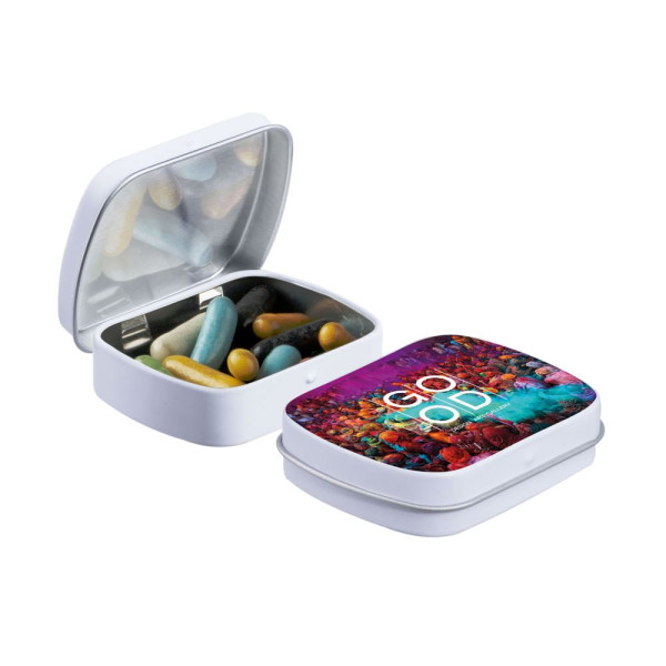 Mini white hinge tin with approx. 23 grams of Mini Choco's, printed in full color. Includes... more