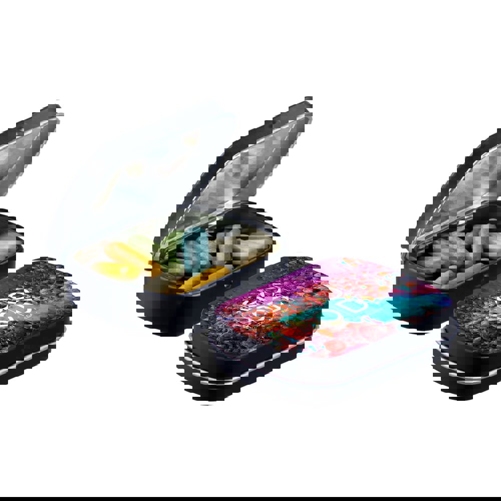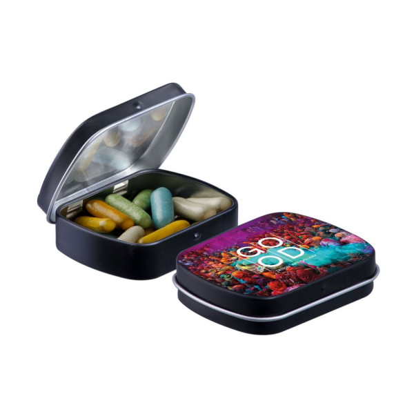 Mini frosted black hinge tin with approx. 23 grams of Licorice sticks mix, printed in full color. Includes ingredient sticker and seal.
