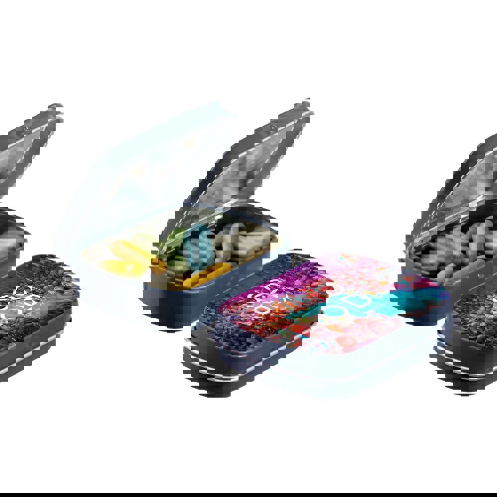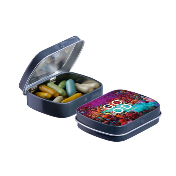 Mini dark grey hinge tin with approx. 23 grams of Licorice sticks mix, printed in full color. Includes ingredient sticker and seal.