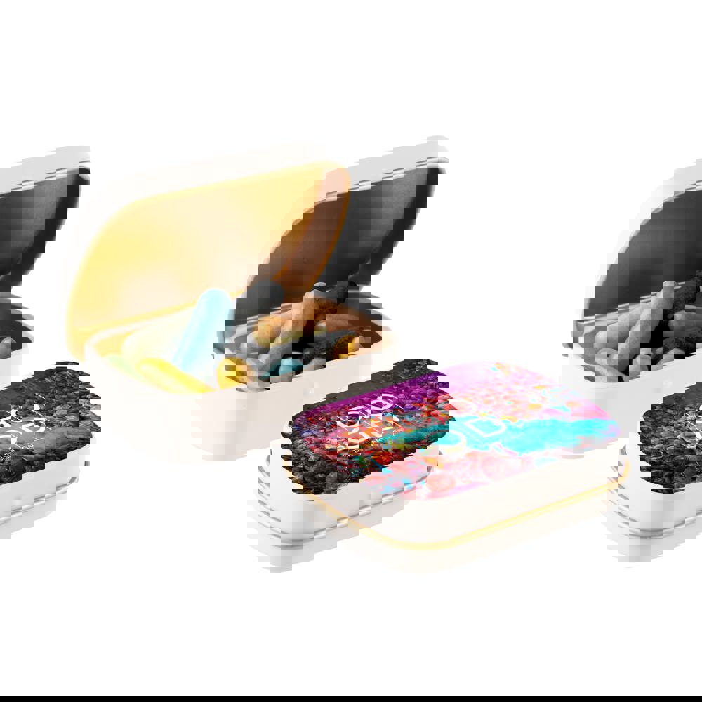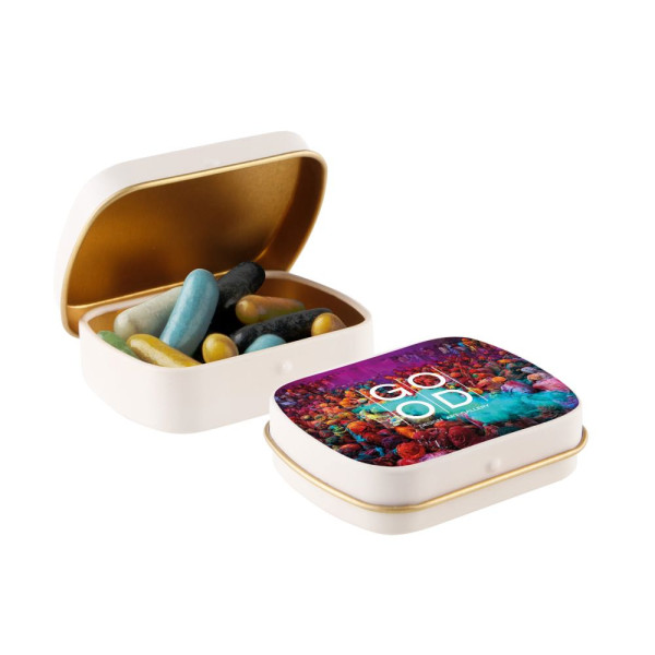 Mini hinge tin frosted sand with a gold interior and approx. 23 grams of Licorice sticks mix. Features full color printing and includes ingredient sticker and seal.
