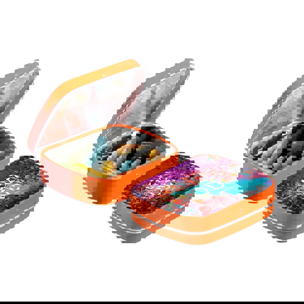 Mini orange hinge tin with approx. 23 grams of Licorice sticks mix, printed in full color. Includes ingredient sticker and seal.