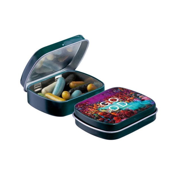 Mini dark green hinge tin with approx. 23 grams of Licorice sticks mix, printed in full color. Includes ingredient sticker and seal.