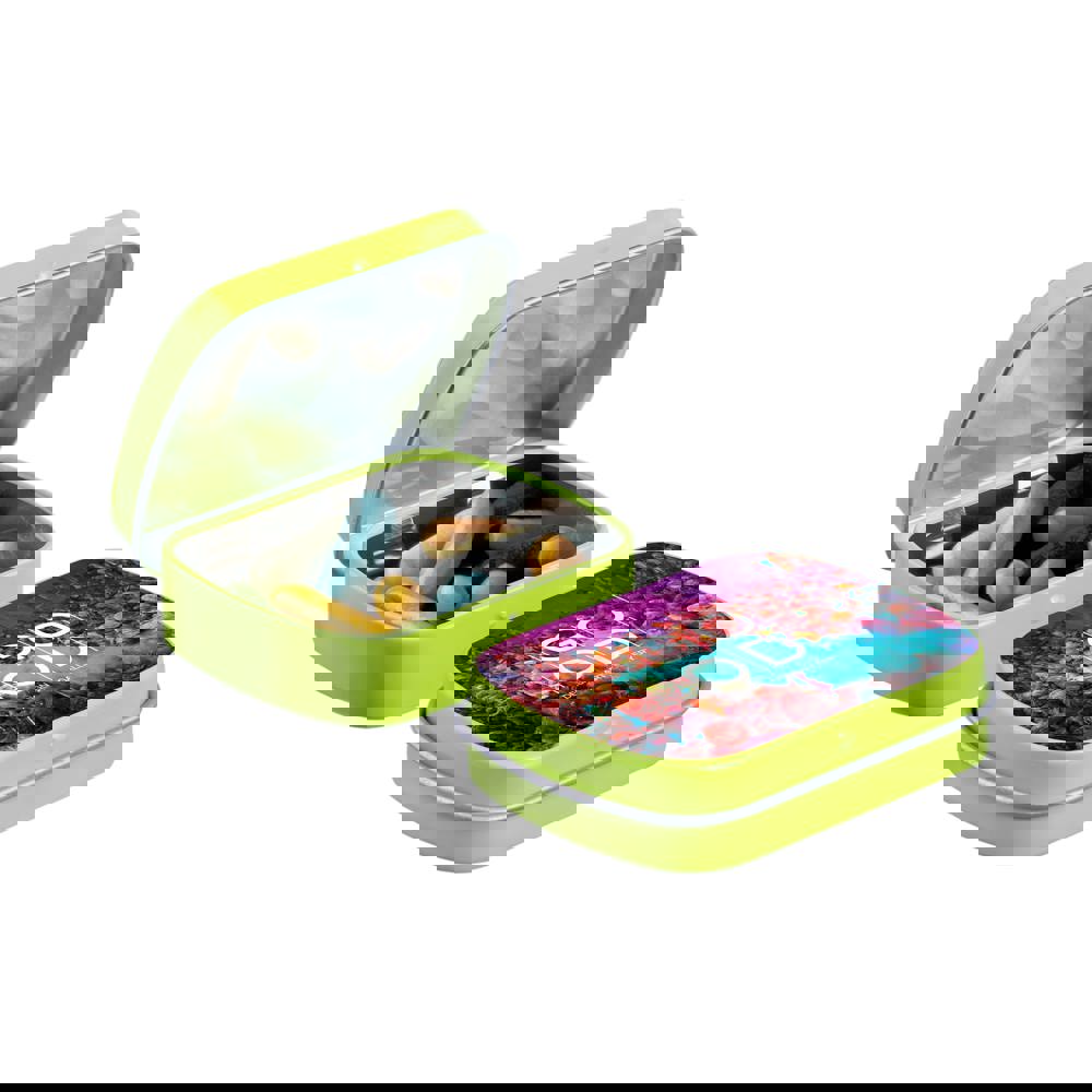 Mini lime hinge tin with approx. 23 grams of Licorice sticks mix, printed in full color. Includes ingredient sticker and seal.