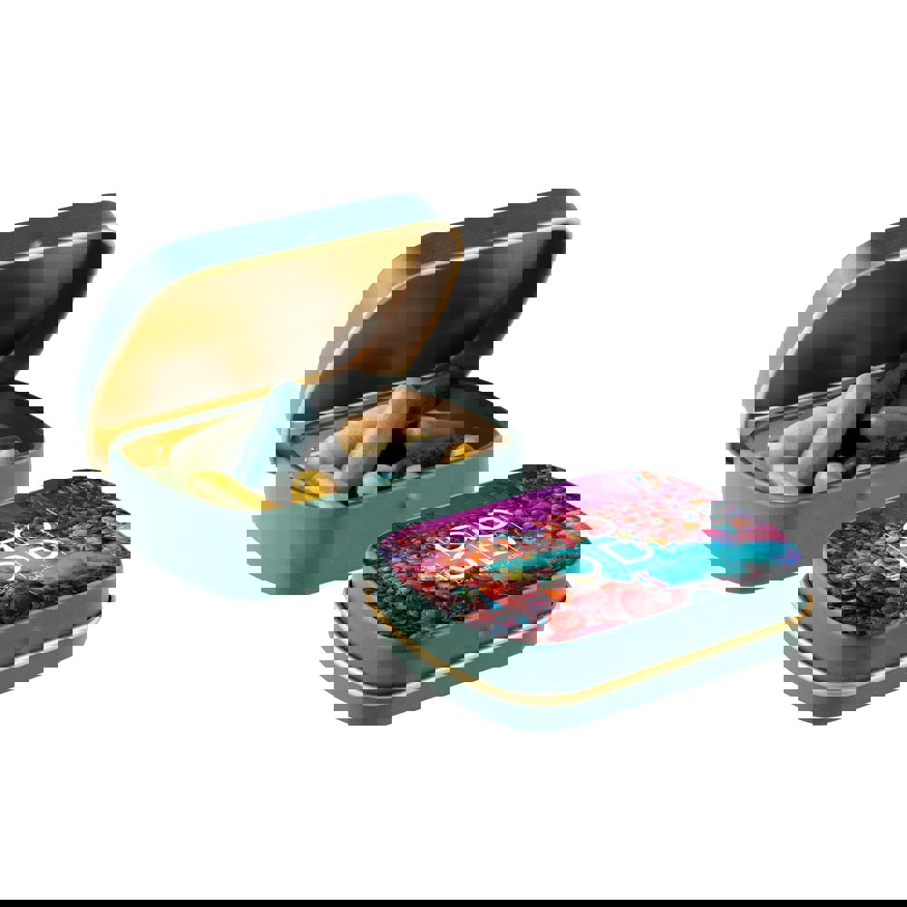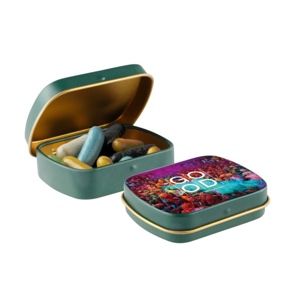 Mini hinge tin frosted green with a gold interior and approx. 23 grams of Licorice sticks mix. Features full color printing and includes ingredient sticker and seal.