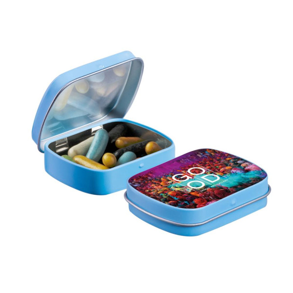 Mini light blue hinge tin with approx. 23 grams of Licorice sticks mix, printed in full color. Includes ingredient sticker and seal.