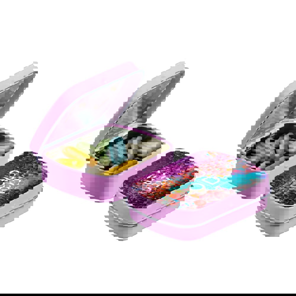 Mini pink hinge tin with approx. 23 grams of Licorice sticks mix, printed in full color. Includes ingredient sticker and seal.