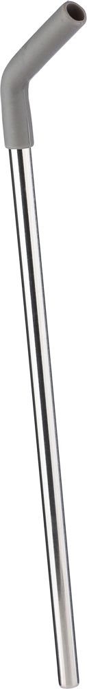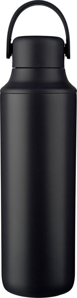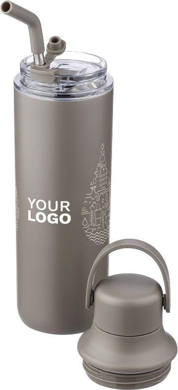 Stainless steel double-walled drinking bottle (500 ml) with interior made of stainless steel 304 and exterior of stainless steel 201. Supplied with two lids: a PP lid with carrying handle and a transparent PS lid for use with the included stainless steel straw with silicone tip and holder. Individually packaged in a brown cardboard box.