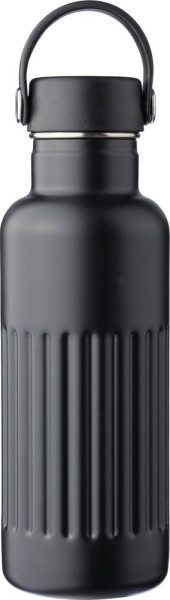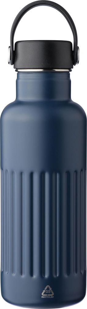 Recycled stainless steel drinking bottle (500 ml). The interior is made of stainless steel 304 and the exterior is stainless steel 201 with a ridge grip design. Features a PP and iron lid with a TPE handle for easy carrying. Includes an engraved recycled logo on the body. Individually packaged in a brown cardboard box.