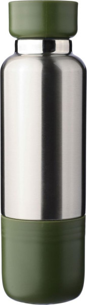 Stainless steel double-walled drinking bottle (500 ml) with an interior made of stainless steel 304 and an exterior of stainless steel 201. Features a PP screw lid with transparent AS compartment, interchangeable polyester wrist and carrying straps, and a 200 ml PP drinking cup in the base. Silver body with matte detail colors. Individually packaged in a white cardboard box.