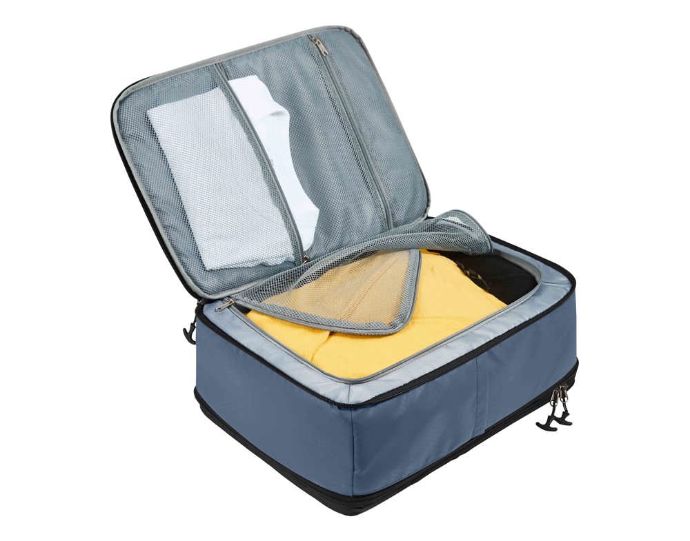 spacious and elaborately crafted business travel backpack; large front zipped pocket and functional loop strap; side slip-in pocket for drink bottles, for example; two handles; large padded main luggage compartment with mesh lid, 2-way zip and side mesh pocket and key strap; two zipped mesh pockets in the main compartment lid; main compartment volume extension; separately accessible 2-way zipped compartment for work equipment: Tablet and notebook compartment, both with velour lining and elastic fastening loop; mesh pocket; slip-in pocket suitable for A4 documents; pen loop; well-padded back carrying system with adjustable chest strap; fastening loop for trolley bar on the back