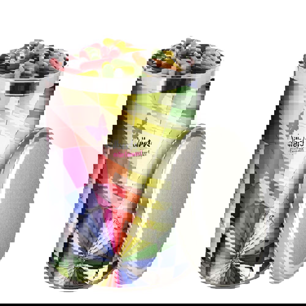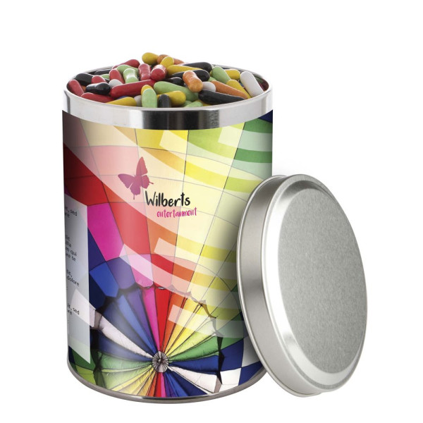 Large 1.3 liter can with a full color printed sleeve and filled with approx. 1110 grams of Licorice sticks mix