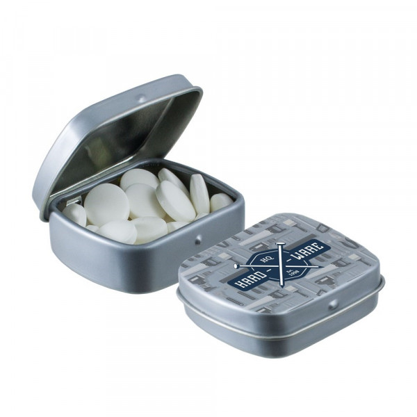 Micro hinged tin grey filled with approx. 9 gram mints, including ingredients sticker and seal