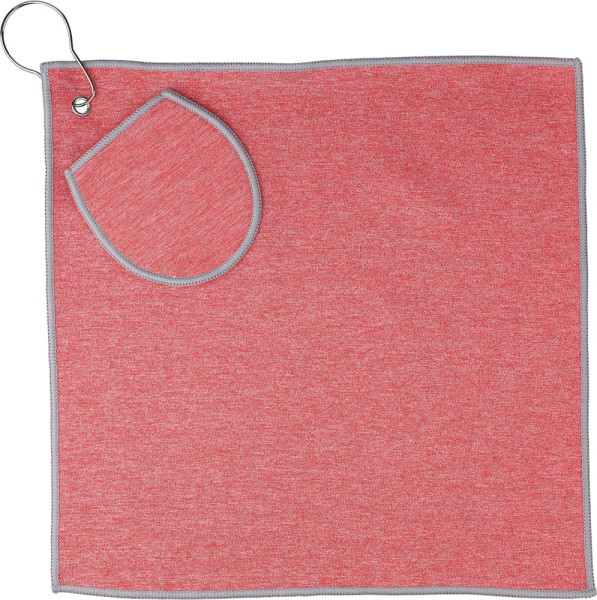 Toalla de golf de rPET con bolsillo para una pelota. Presentada en una funda con mosquetón de metal para sujetarlo fácilmente a su bolsa e incluye en el interior una etiqueta indicando que es material reciclado. Lavable a máquina (con agua fría).