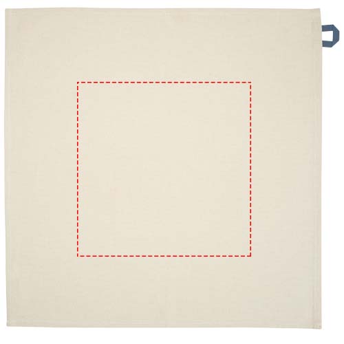 Paño de cocina confeccionado en algodón reciclado 100 % de 200 g/m² con certificado GRS y un distintivo lazo en contraste. Tamaño del paño: 50 x 50 cm.