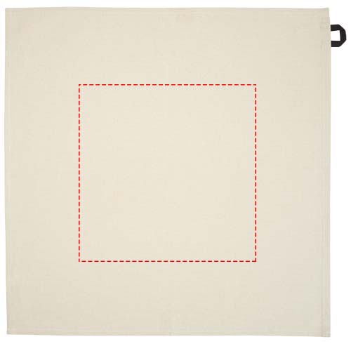 Paño de cocina confeccionado en algodón reciclado 100 % de 200 g/m² con certificado GRS y un distintivo lazo en contraste. Tamaño del paño: 50 x 50 cm.