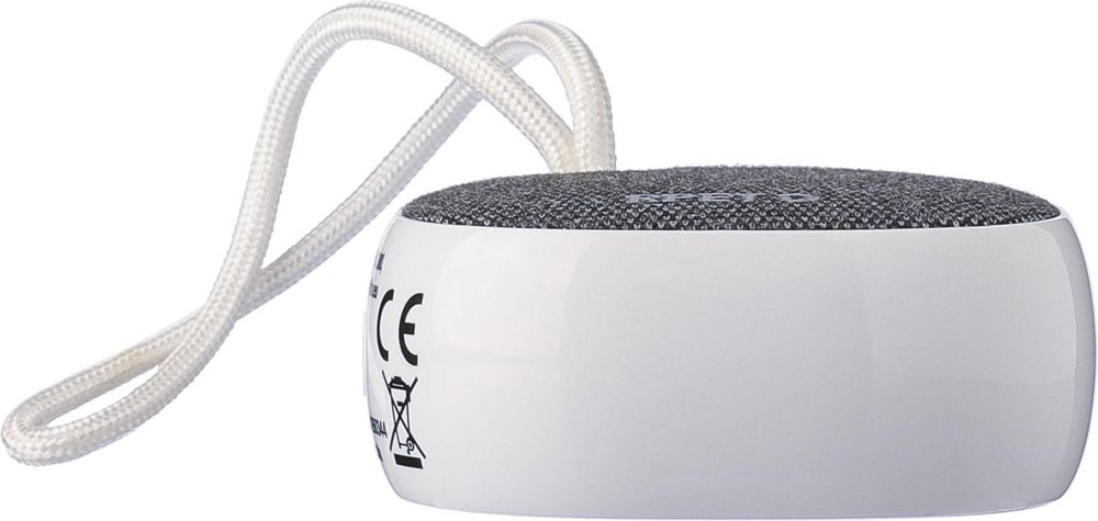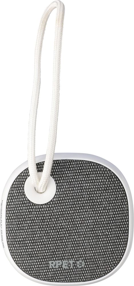 Altavoz inalámbrico de ABS reciclado y tela rPET con un pequeño cordón de nailon. Batería de 300 mAh con salida de 3 W, tecnología inalámbrica versión 5.3 y alcance de 10 metros. Tiempo de carga aproximado: 2 horas, con tiempo de reproducción de 2 a 3 horas. Incluye cable de carga USB-C blanco de 30 cm. Presenta el logotipo de rPET en la tela y el logotipo de ABS reciclado en el lateral. Presentado en una caja de cartón marrón.