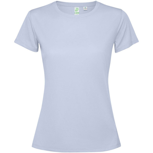 Camiseta técnica entallada de manga corta para mujer. Cuello con costuras a juego. Dobladillo trasero ligeramente más largo que el delantero. Costuras laterales desplazadas hacia delante.