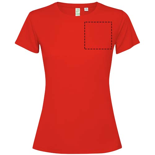 Camiseta técnica entallada de manga corta para mujer. Cuello con costuras a juego. Dobladillo trasero ligeramente más largo que el delantero. Costuras laterales desplazadas hacia delante.
