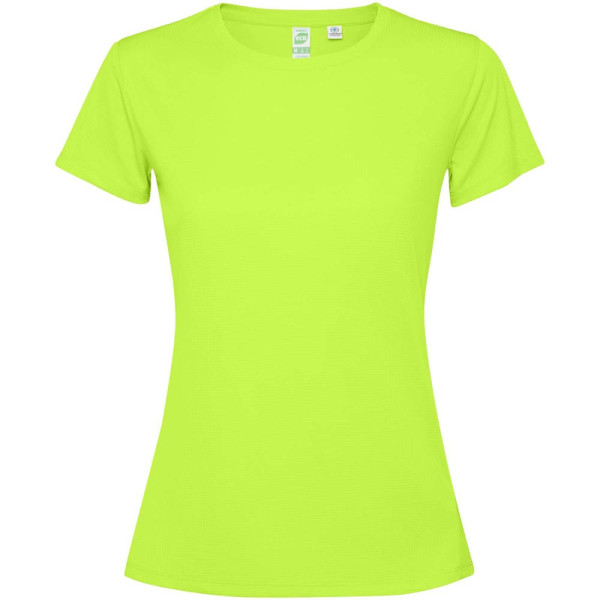 Camiseta técnica entallada de manga corta para mujer. Cuello con costuras a juego. Dobladillo trasero ligeramente más largo que el delantero. Costuras laterales desplazadas hacia delante.