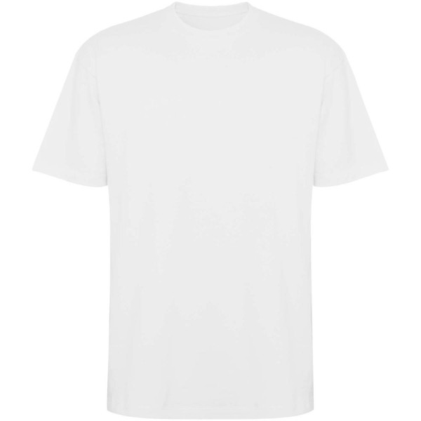 Camiseta holgada de manga corta. Cuello redondo ribeteado en canalé 2x1 con cubre costuras a juego. Costuras laterales. Doble costura ancha en las mangas y el dobladillo. Etiqueta extraíble.