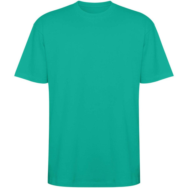 Camiseta holgada de manga corta. Cuello redondo ribeteado en canalé 2x1 con cubre costuras a juego. Costuras laterales. Doble costura ancha en las mangas y el dobladillo. Etiqueta extraíble.
