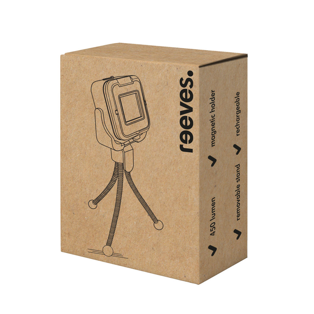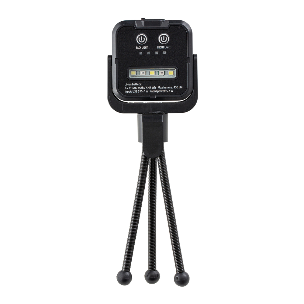 The rechargeable, magnetic REEVES-Strogan work light features LED lights on both sides and stands securely on a detachable tripod base with flexible legs.
