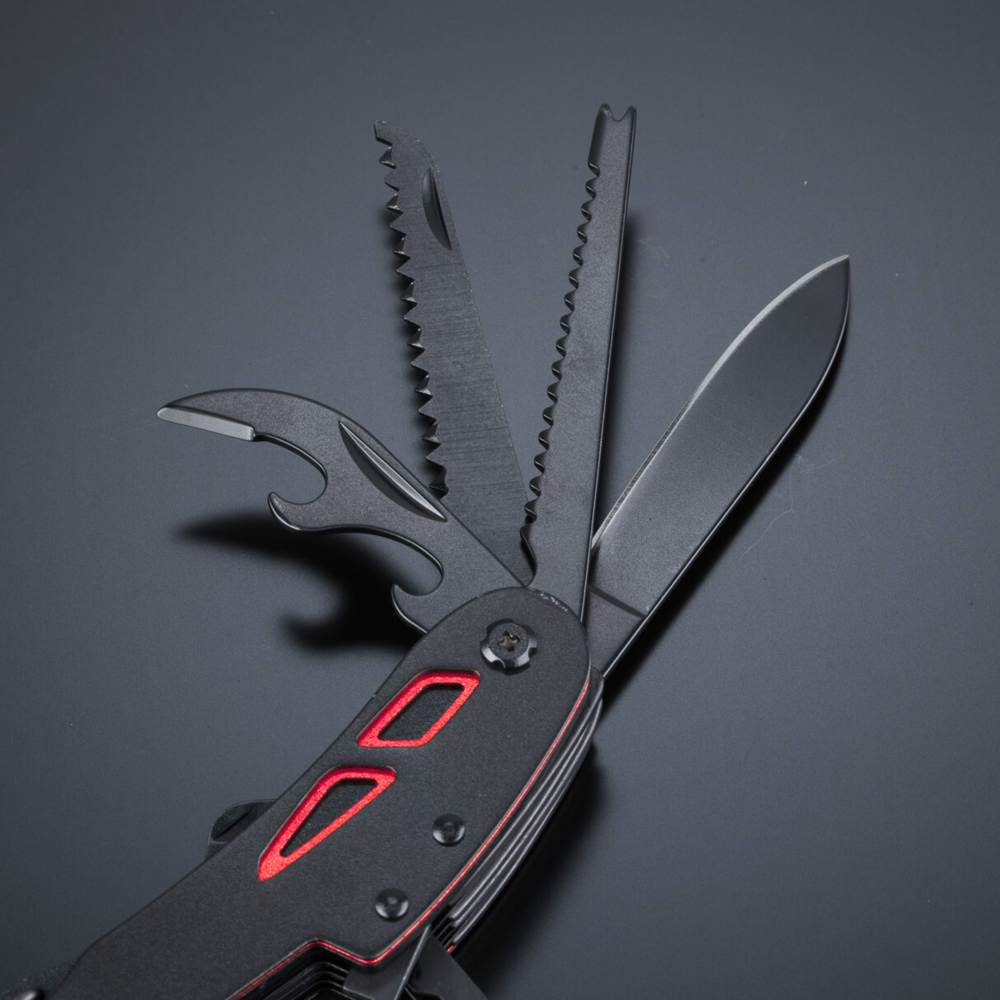 Optima pocket knife in new guise, made of high-quality stainless steel with titanium coating for improved hardness and extra corrosion resistance. Colorful inserts on the handle for subtle decoration. Main features: scissors, knife, wood saw, bottle and can opener, fish scraper, corkscrew, punch (for puncturing e.g. a can of juice), threader (for patching inner tubes, sewing sail rafts, patching a tyre), nail file, Phillips screwdriver. The penknife ends in a carabiner so that you can always have it with you.