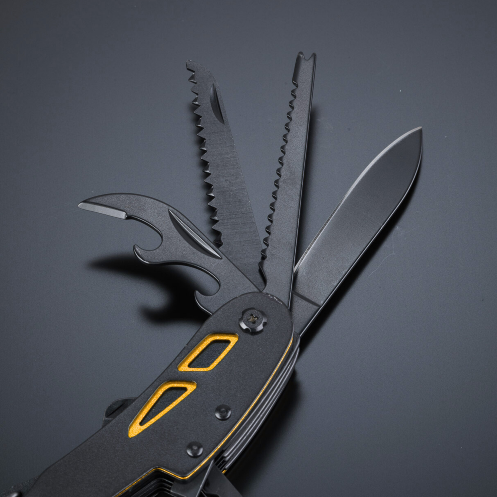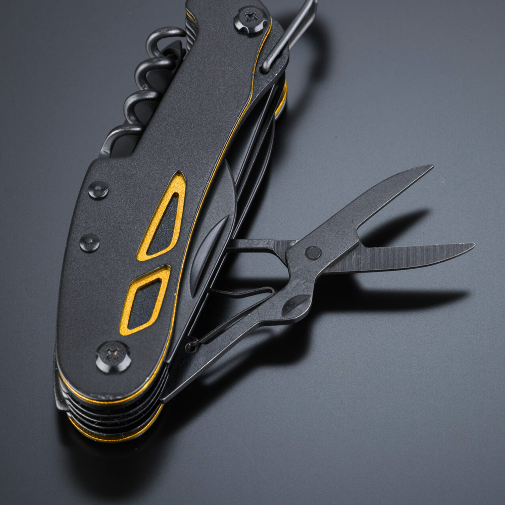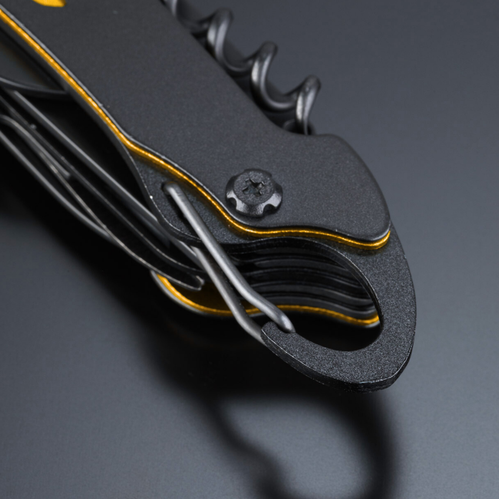 Optima pocket knife in new guise, made of high-quality stainless steel with titanium coating for improved hardness and extra corrosion resistance. Colorful inserts on the handle for subtle decoration. Main features: scissors, knife, wood saw, bottle and can opener, fish scraper, corkscrew, punch (for puncturing e.g. a can of juice), threader (for patching inner tubes, sewing sail rafts, patching a tyre), nail file, Phillips screwdriver. The penknife ends in a carabiner so that you can always have it with you.