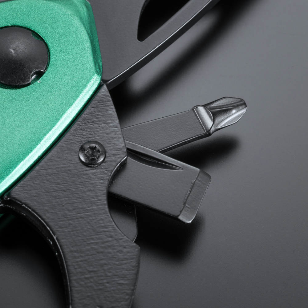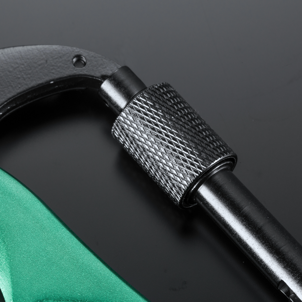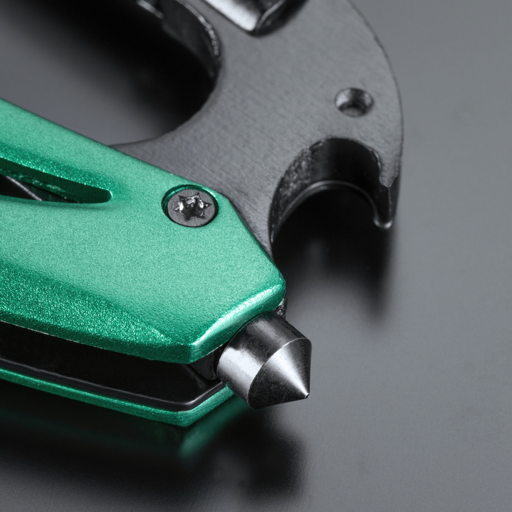Main features: sharp stainless steel knife, flat and scalloped wrench tip, shackle-type handle, glass punch, bottle opener. Folding, can be clipped to trousers or backpack. Colour anodised metal body, finished with a large carabiner.