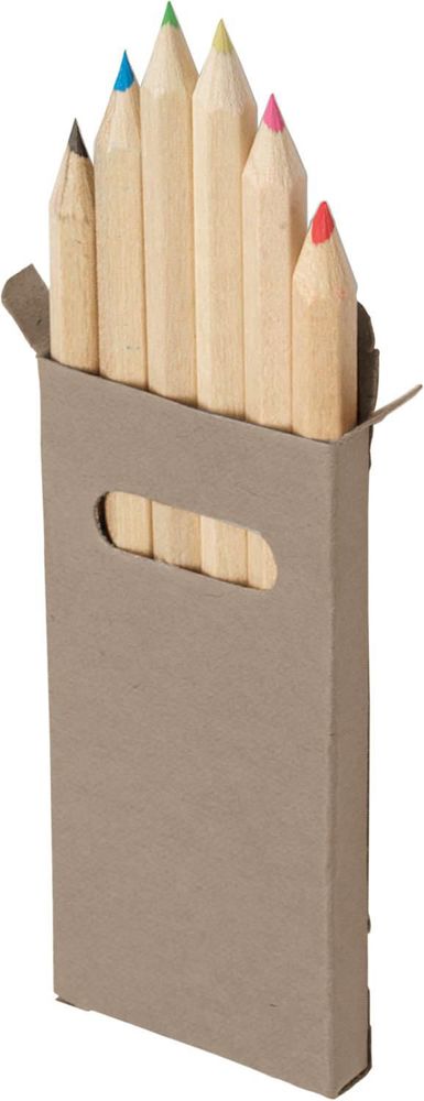 Caja de cartón con 6 lápices cortos de madera, de diferentes colores.más