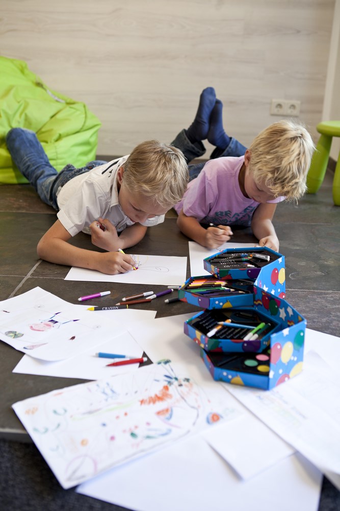 Set de pinturas de 56 piezas en un estuche hexagonal de cartón. Incluye ceras, lápices de colores, rotuladores, acuarelas, 1 goma de borrar, sacapuntas y clip.