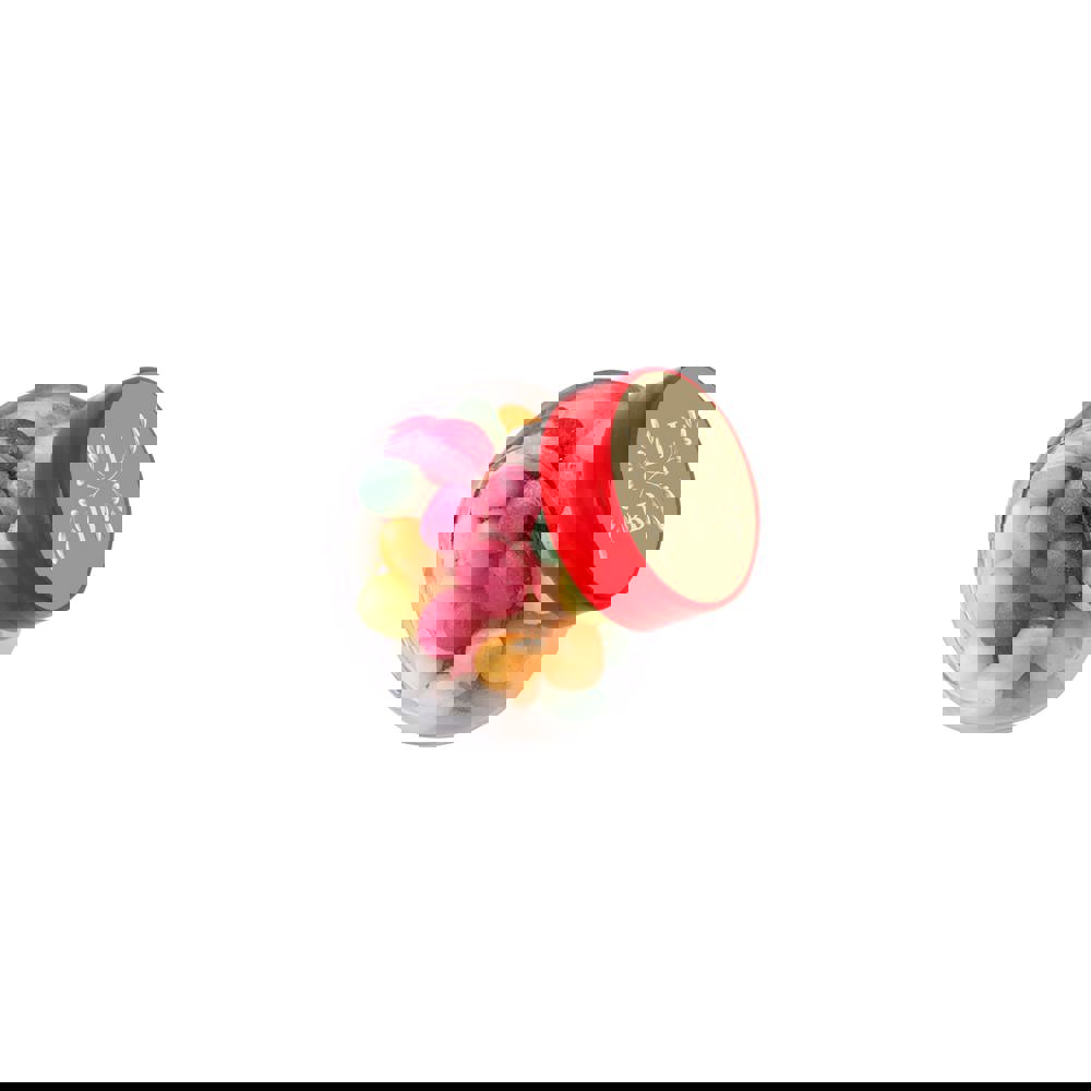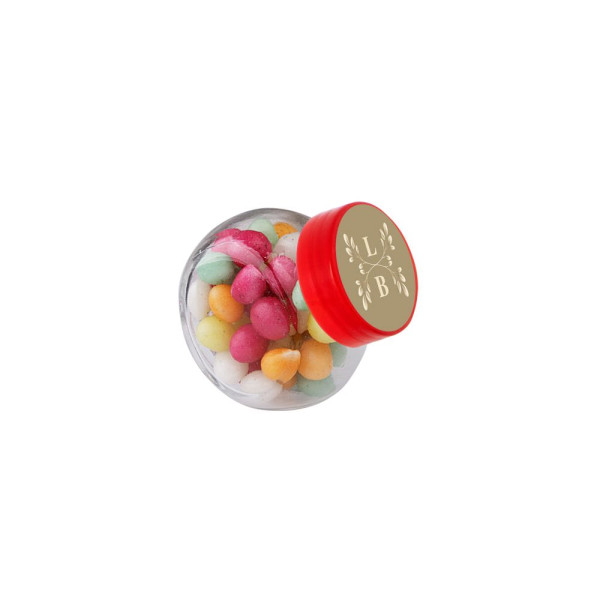 Micro glass jar 50 ml with red lid, including full colour printed sticker on the lid, filled with Colourd Sugar Eggs