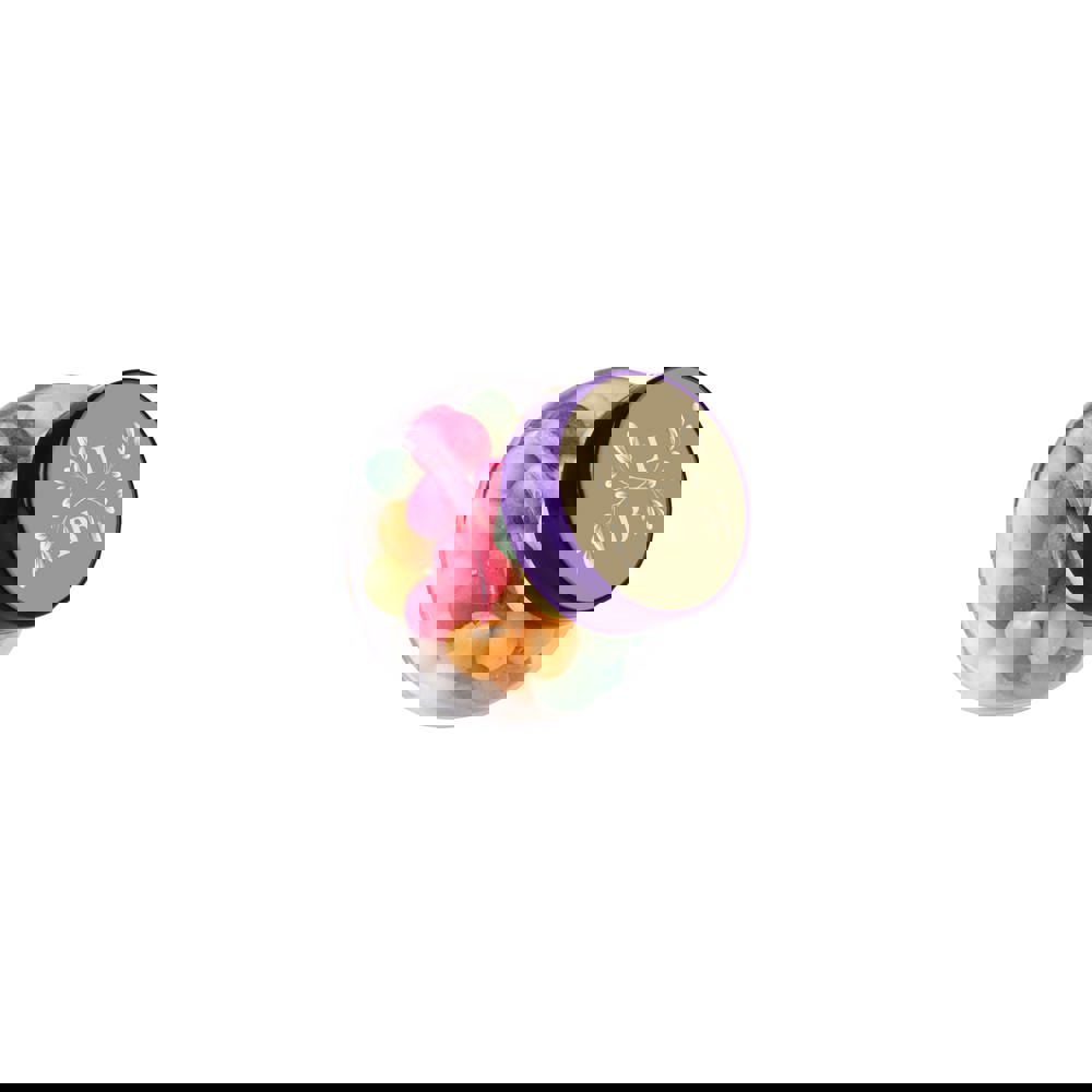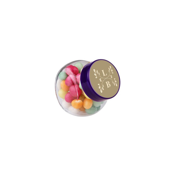 Micro glass jar 50 ml with purple lid, including full colour printed sticker on the lid, filled with Colourd Sugar Eggs