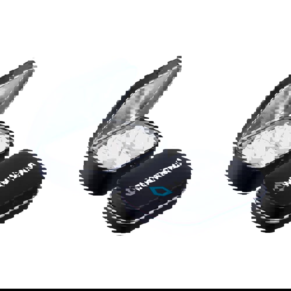 Mini hinged tin white filled with approx. 23 gram logo mints, including ingredients sticker and seal more