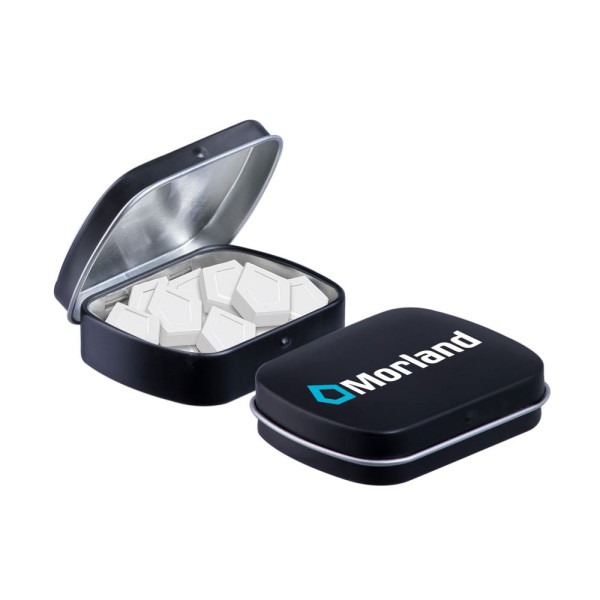 Mini hinged tin matt black filled with approx. 23 gram logo mints, including ingredients sticker and seal