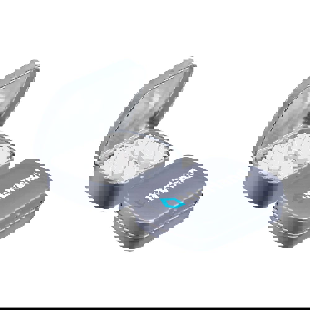 Mini hinged tin grey filled with approx. 23 gram logo mints, including ingredients sticker and seal