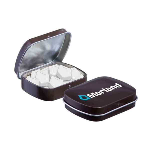 Mini hinged tin brown filled with approx. 23 gram logo mints, including ingredients sticker and seal
