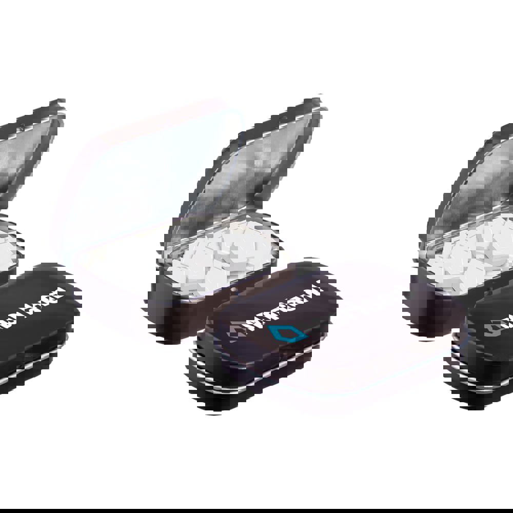 Mini hinged tin white filled with approx. 23 gram logo mints, including ingredients sticker and seal more