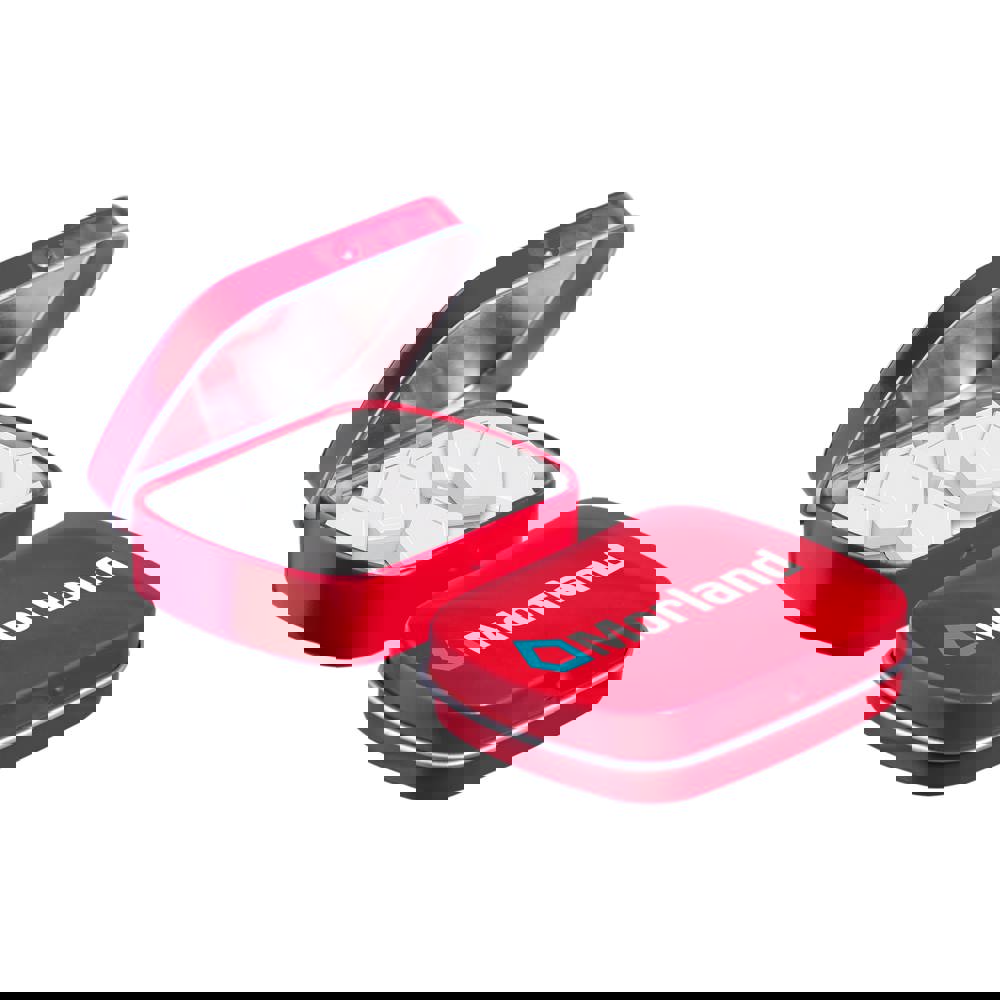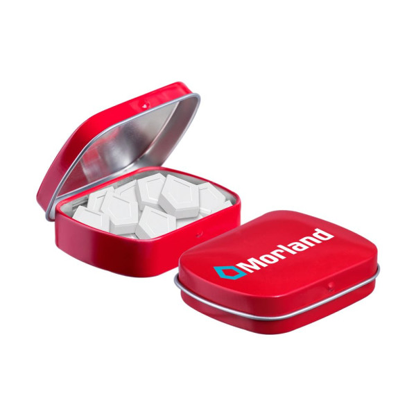 Mini hinged tin red filled with approx. 23 gram logo mints, including ingredients sticker and seal